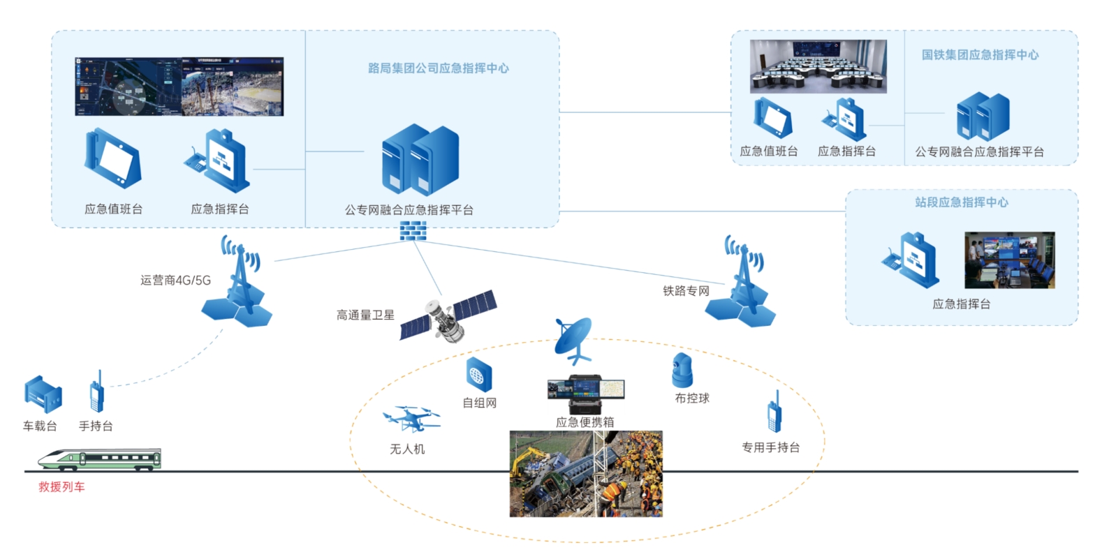 铁路公专网融合应急通信系统以飞鸿融合调度通信平台为基础,融合GIS、北斗时空定位、应急大数据等ICT技术构建,因地制宜,支持4G/5G公网、高通量宽带卫星、自组网及铁路专网快速接入,现场采用轻量化应急装备,即开即用,从而构建空天地一体、敏捷高效、极限通信的应急通信保障系统,为各级部门给予随时随地可见、可指挥、可决策的应急指挥服务。